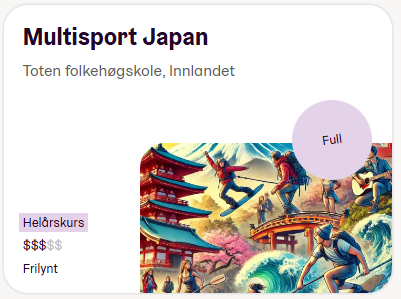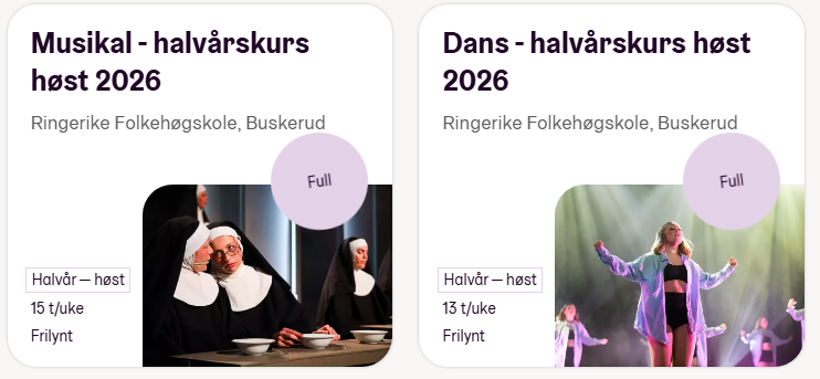Flere linjer er fulle, har venteliste eller har få plasser igjen. Bilde fra Folkehøgskolenes søkeside.